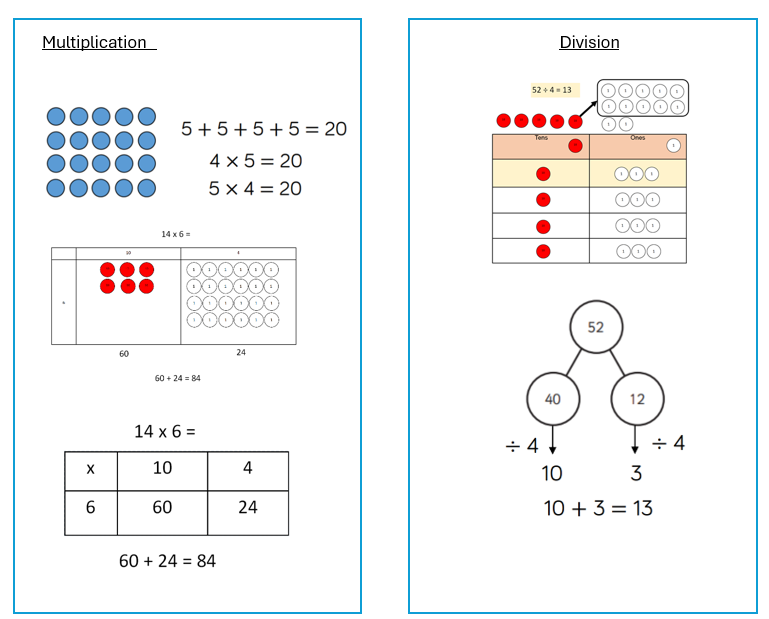 In maths we will be developing our knowledge of the four operations using arrays to help us with mulitiplication, leading into grid method when we begin to look at multiplying larger numbers. In division, we will recap sharing and grouping as well as using place value grids to support division of larger numbers. We will be looking at this written method alongside practical resources to develop our understanding.